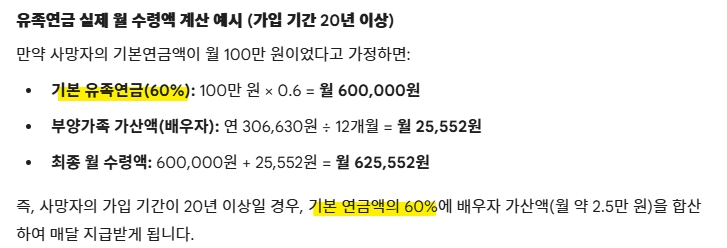※ 주의: 부양가족 가산액은 연간 합색 금액 기준이며, 매월 연금 지급 시에는 해당 금액의 1/12씩 나누어 기본 유족연금액에 더해 지급됩니다.