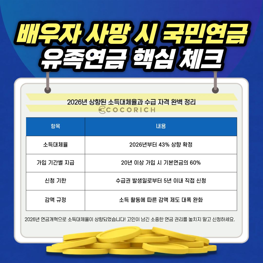 국민연금은 이러한 상황을 대비하여 유족연금 제도를 운영하고 있으며 특히 2026년에는 연금개혁안이 본격적으로 시행되면서 소득대체율이 43퍼센트로 상향 확정되는 등 수급자에게 유리한 변화가 나타나고 있습니다.