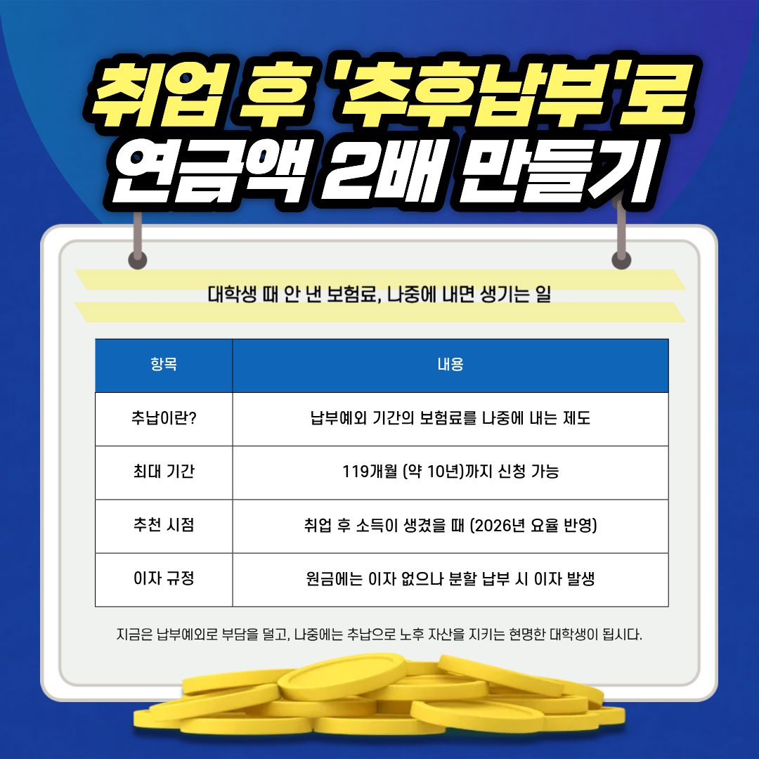 | 추후납부(추납) | 취업 후 여유 있을 때 납부 가능 | 최대 119개월(10년 미만) |