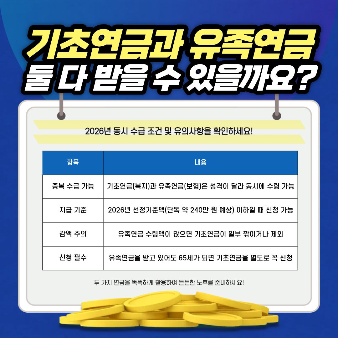 결론적으로 기초연금과 유족연금은 동시에 받을 수 있으며 소득 기준만 충족한다면 두 제도를 모두 활용하는 것이 노후 자금 확보에 가장 유리합니다.