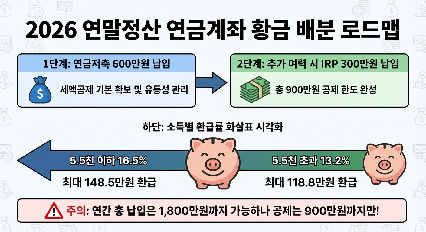 따라서 최대치의 환급을 노린다면 연금저축 600만 원과 IRP 300만 원을 조합하는 것이 2026년 연말정산의 정석이라 할 수 있습니다.