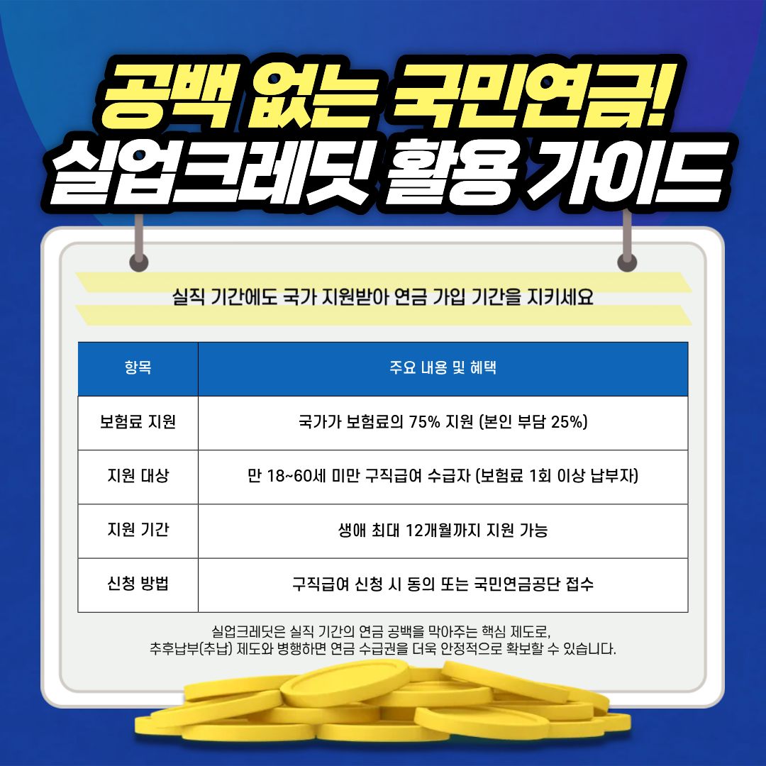실업크레딧은 구직급여를 받는 실직자가 국민연금 보험료 납부를 계속하길 원할 때 국가가 보험료의 75%를 지원해 주는 든든한 제도입니다.
