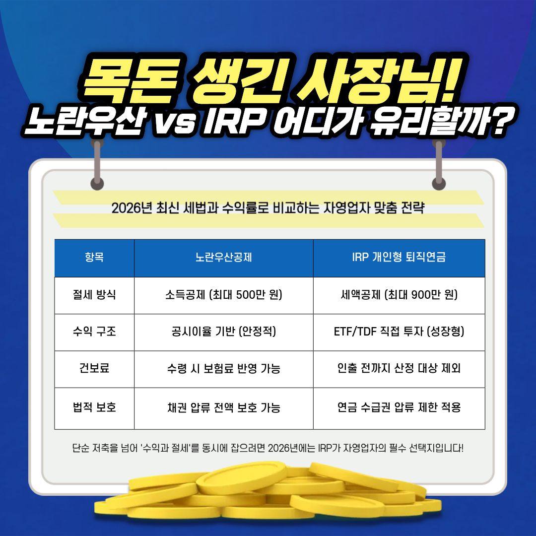 정리하자면 목돈이 생긴 자영업자에게 노란우산공제의 안정성도 가치가 있지만, 2026년의 고도화된 금융 환경에서는 IRP가 제공하는 높은 세액공제, ETF를 통한 유연한 기대 수익률, 그리고 인출 전 건보료 산정 제외 혜택이 매우 강력한 메리트를 가집니다.