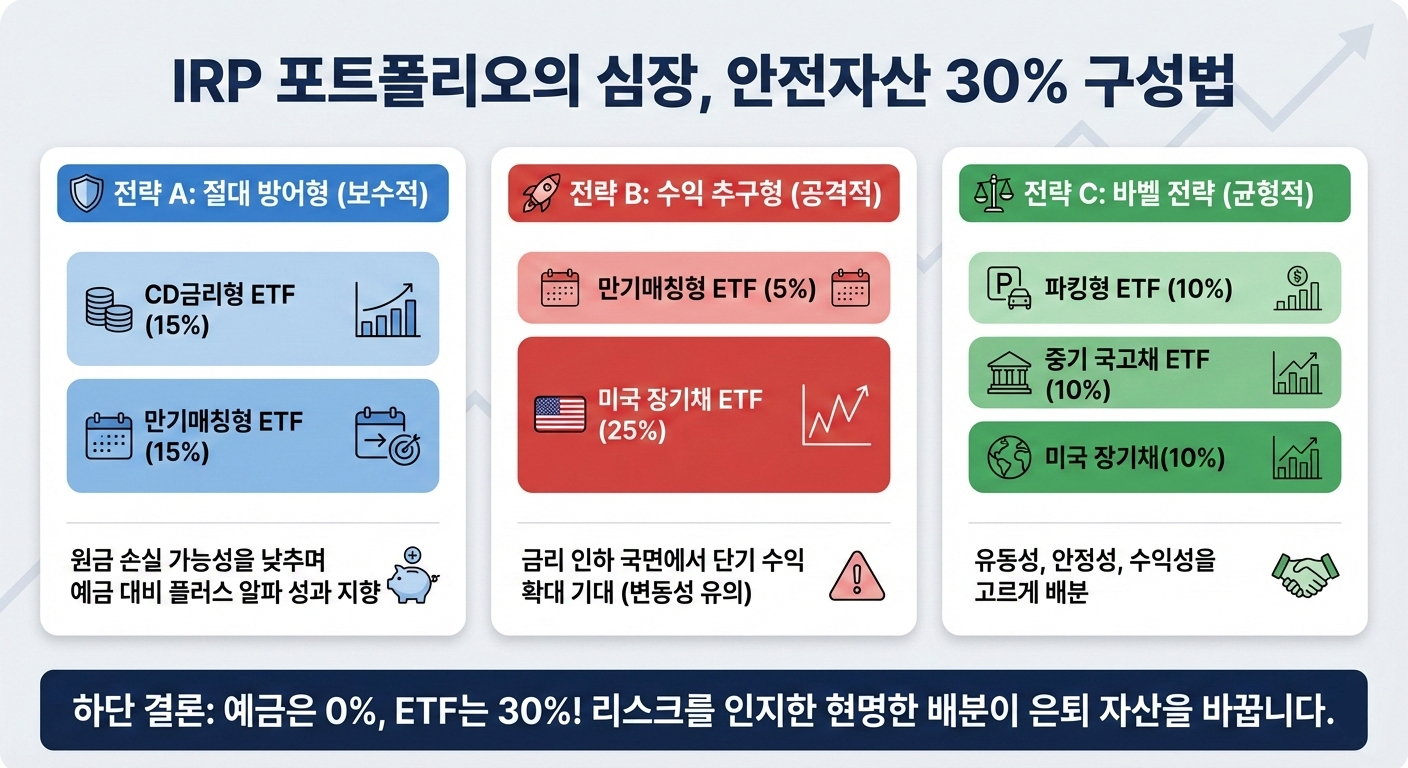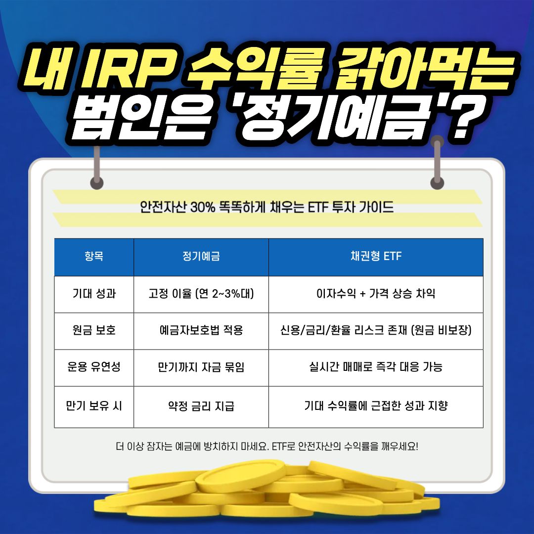 IRP 계좌에서 수익률을 깎아먹는 단순 예금 대신 안전자산 30%를 알차게 채울 수 있는 채권형 ETF 투자 전략을 정리했습니다.