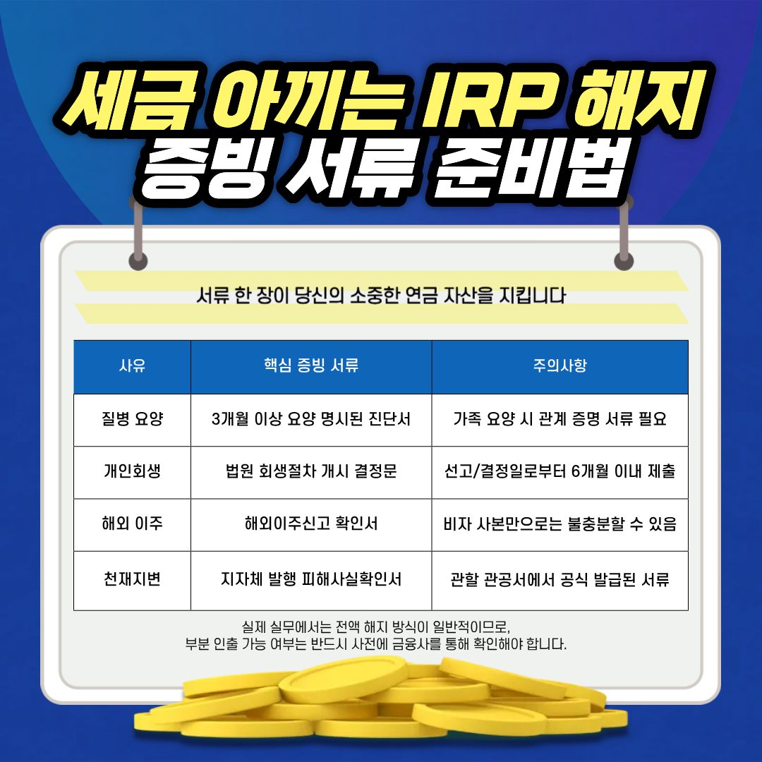 IRP 중도 해지는 노후 준비의 연속성을 깨뜨리는 가슴 아픈 결정일 수 있지만, 불가피한 상황이라면 제도를 적극 활용해 세금 손실을 최소화해야 합니다.