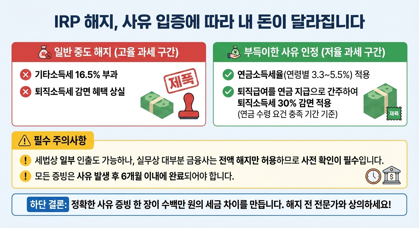 IRP 퇴직연금을 중도 해지할 때 발생하는 고율의 세금 부담을 낮은 연금소득세율(연령에 따라 3.3~5.5%)로 전환할 수 있는 '부득이한 사유' 인정 기준을 정리했습니다.