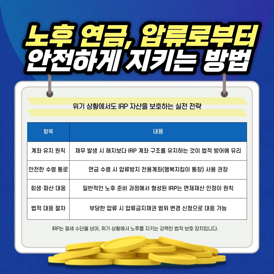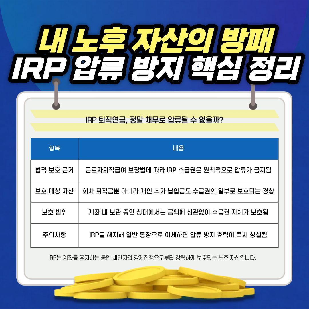 최근 경제적 불확실성이 커지면서 IRP 계좌에 예치된 노후 자금이 채무 문제로 압류될 수 있는지 불안해하는 분들이 많습니다.