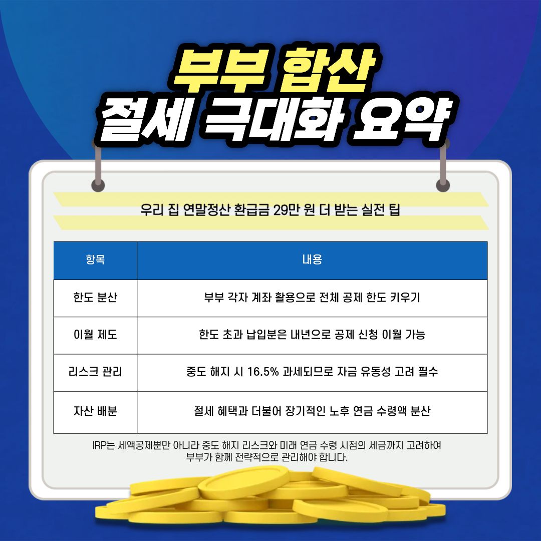 그 결과를 바탕으로 12월 말까지 남은 IRP 납입 한도를 누구에게 채울지 최종 결정하는 습관을 들이면 매년 최적의 환급금 조합을 찾아낼 수 있습니다.