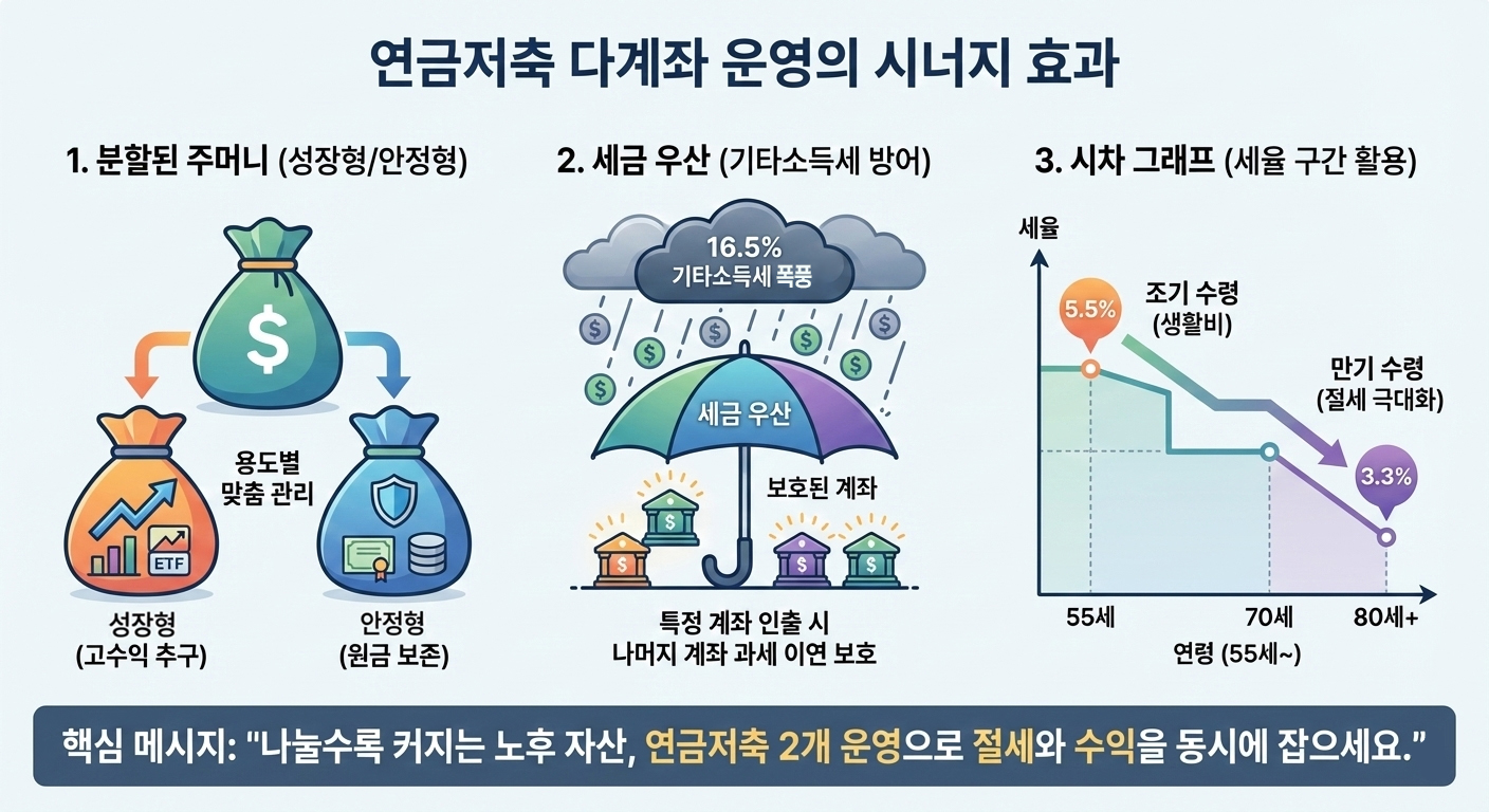 이는 단순한 분산 투자를 넘어 갑작스러운 자금 필요 시 발생할 수 있는 세금 폭탄을 방지하고 연금 수령 시점의 과세 구간을 정교하게 관리하기 위함입니다.