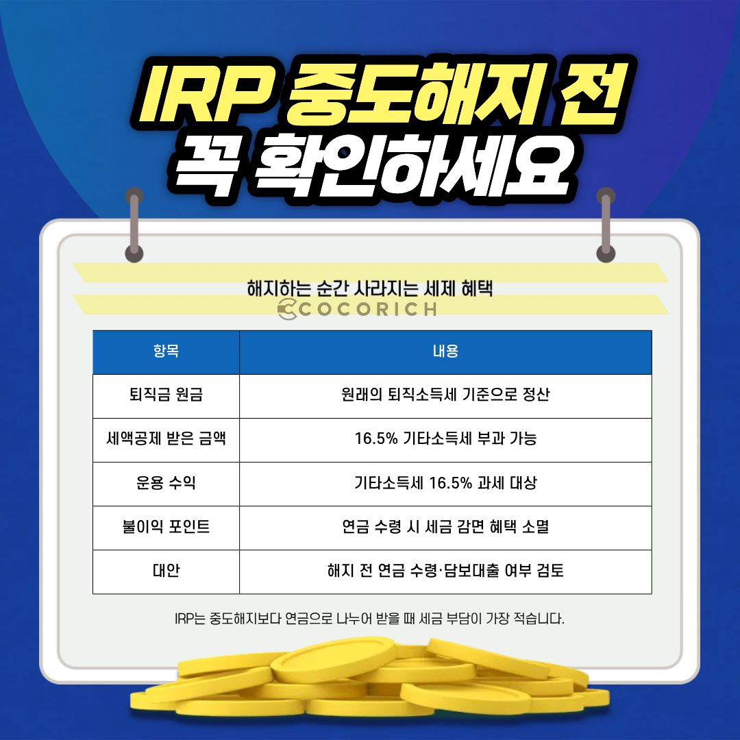 IRP를 중도 해지하면 세제 혜택이 사라질 수 있습니다.