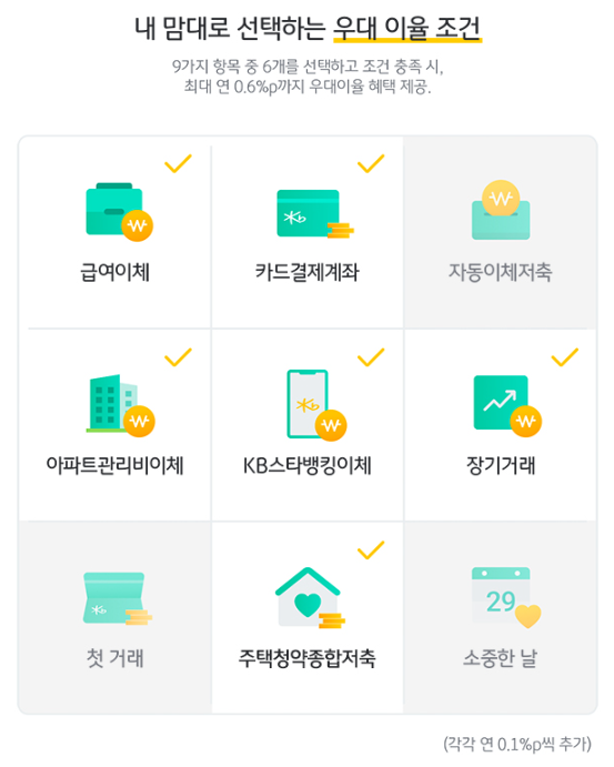 다음 항목 중 2개를 선택하여 총 1.0%p 우대를 받을 수 있습니다.