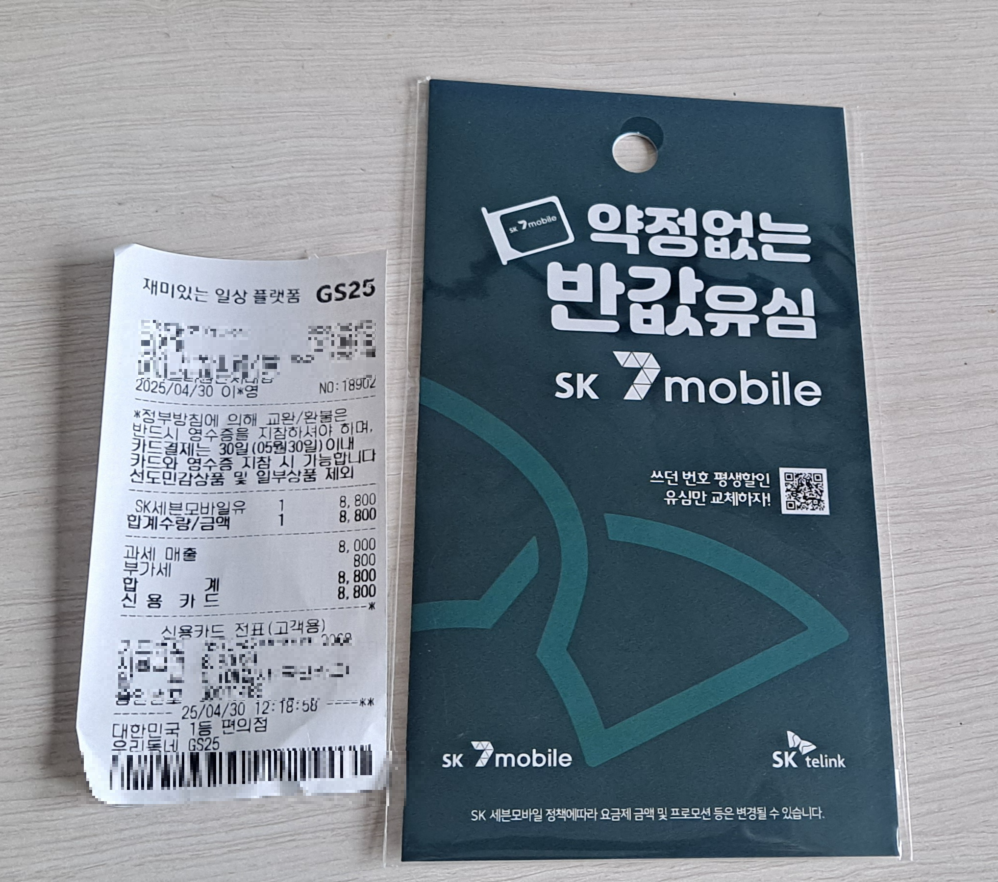 저는 4월 30일 GS25 편의점에서 SK 7모바일 유심을 8,800원에 직접 구매했습니다.