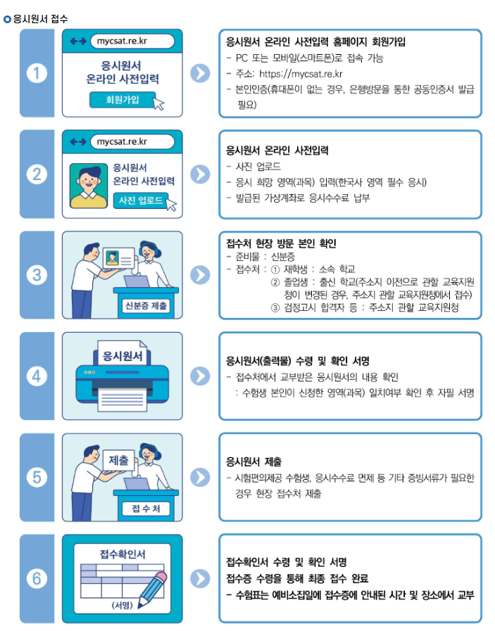 접수는 지정된 교육청이나 고등학교에서 진행되며, 검정고시 합격증명서를 제출해야 합니다.