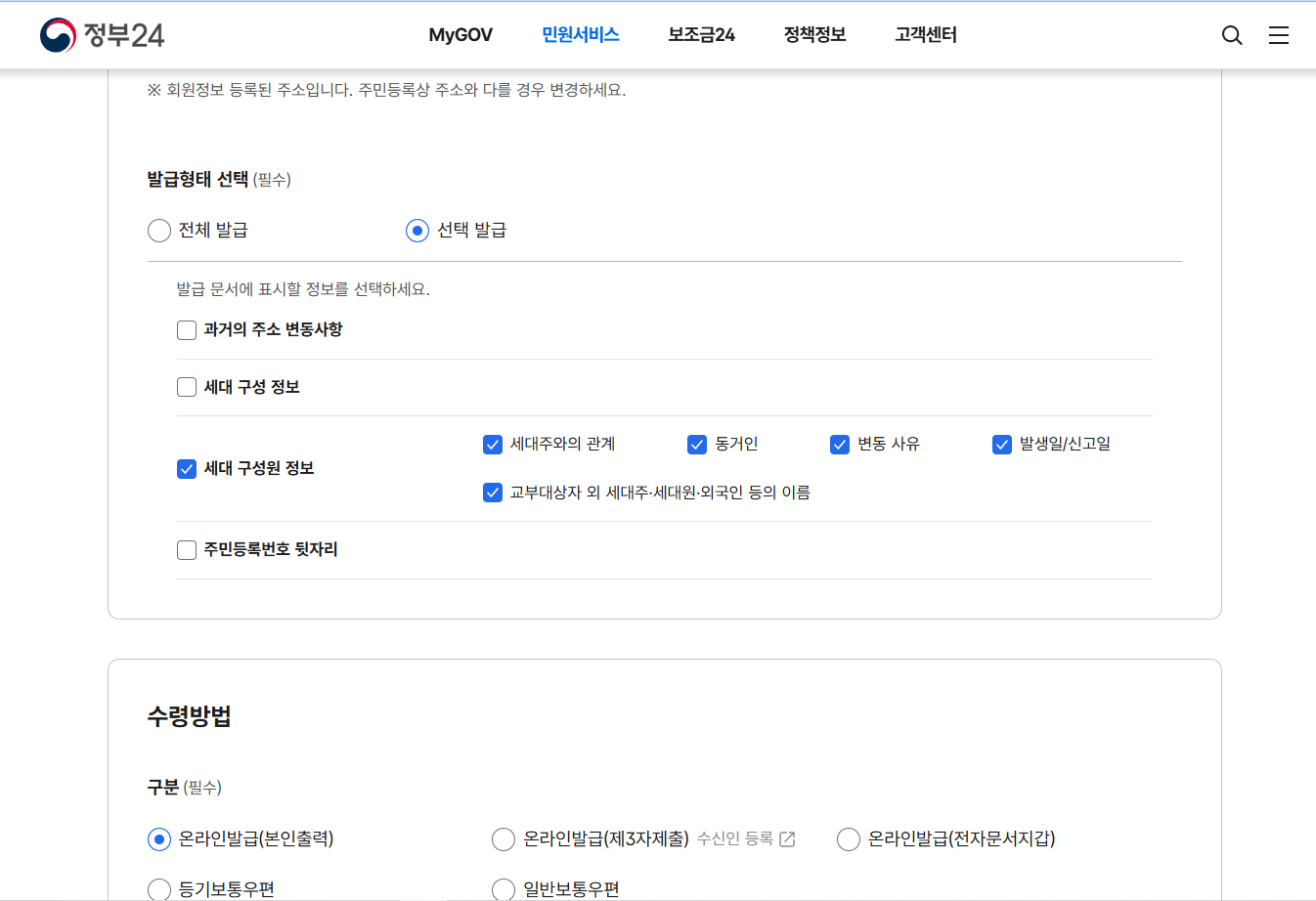 발급형태 선택에서 선택발급 선택후 [주민등록번호 뒷자리] 본인과 세대원 체크하면 됩니다.