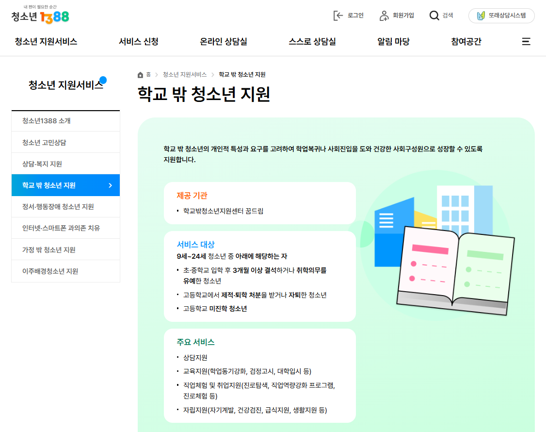 자퇴 후에는 학교밖 청소년 지원센터, 꿈드림 센터 등 지역 청소년 기관을 통해 검정고시 준비, 진로상담, 심리상담, 학습지원 등을 받을 수 있습니다.