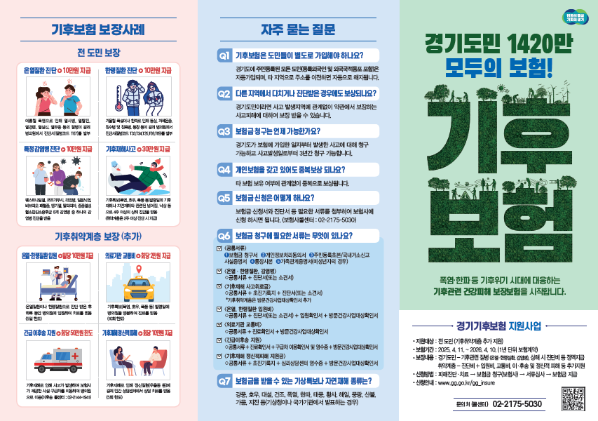 경기도에 주민등록이 되어 있다면 누구나 별도 신청 없이 자동으로 가입되며, 기후로 인한 건강피해 발생 시 보험 혜택을 받을 수 있습니다.