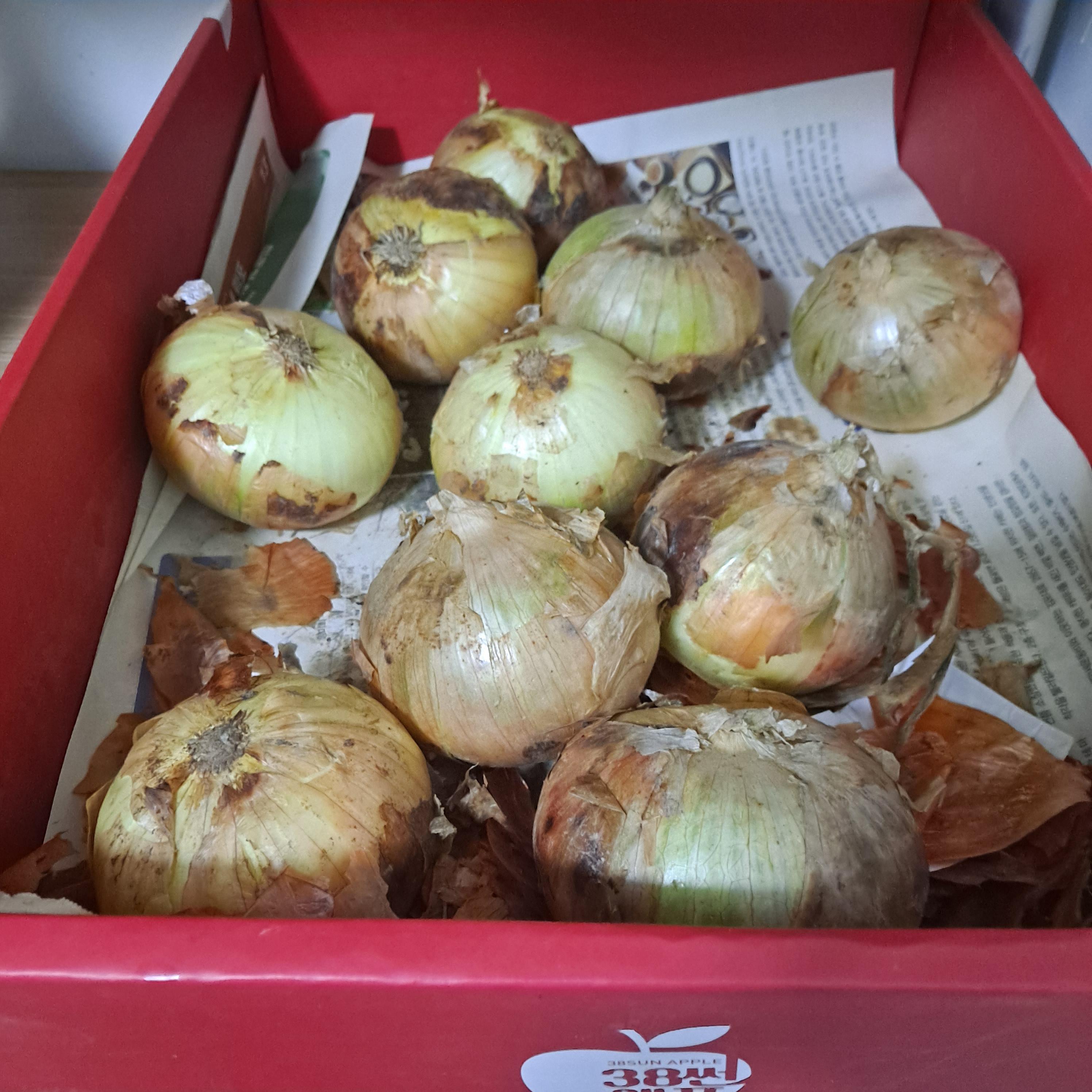 말린 양파를 넓은 종이 상자에 한 개씩 떨어뜨려 보관하면 통풍이 잘 되어 부패를 방지할 수 있습니다.